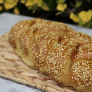 Soft touch braided bread loaf topped with sesame seeds. Apprx. 11″ X 4″