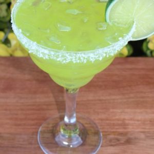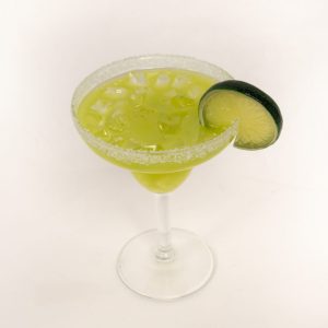 Margarita with ice, salt rim ,and lime on the side of the glass. Each item is approximately 7″ X 5″