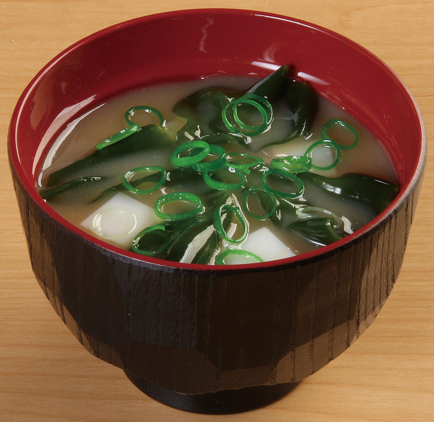 Hyper-realistic Miso Soup with Tofu & Wakame replica, featuring lacquer-style bowl, translucent broth, tofu cubes, seaweed, and green onion garnish. A premium, maintenance-free display solution for authentic Japanese restaurant presentations.