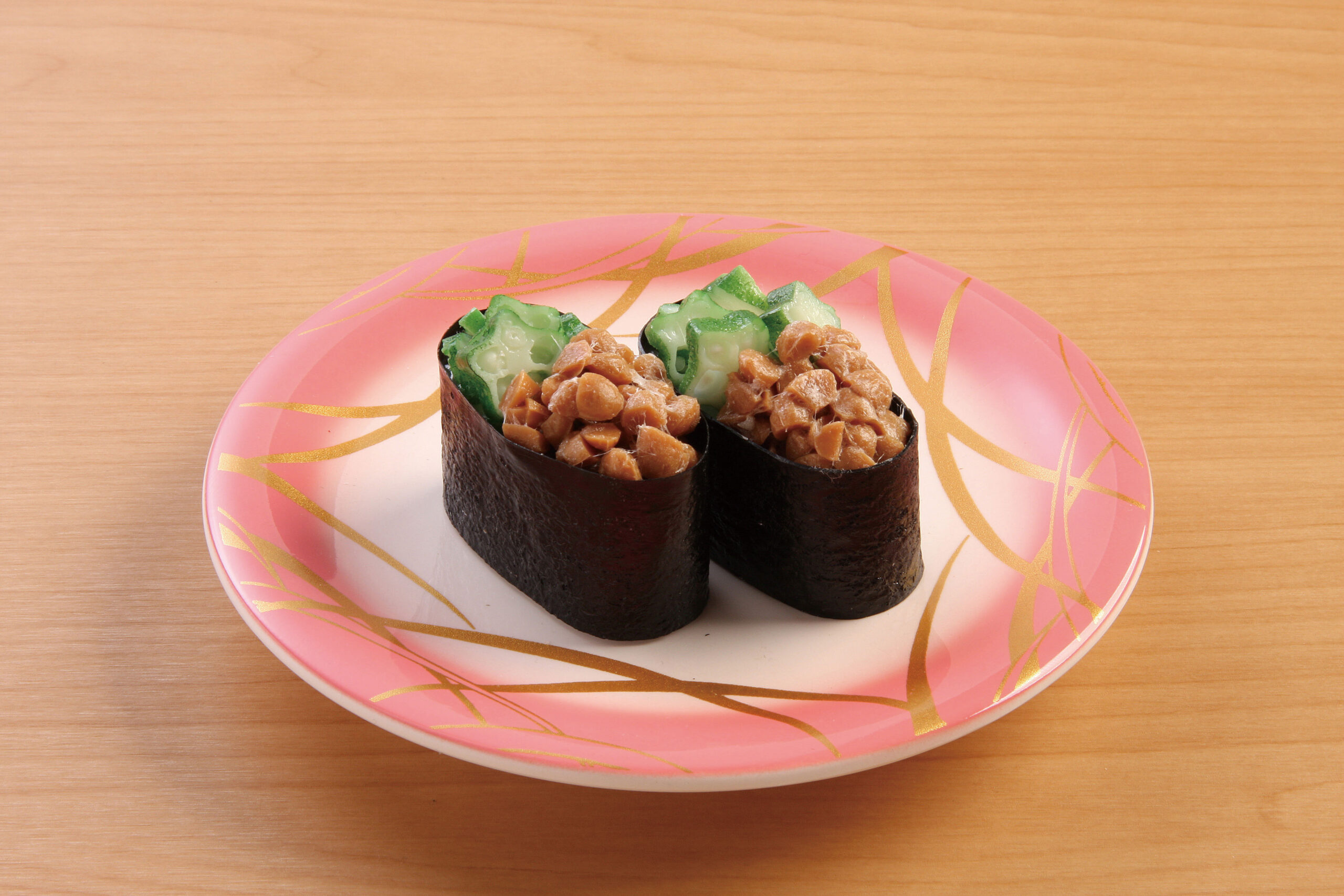 Set of 2 hyper-realistic Natto Gunkan replicas, featuring detailed fermented soybean topping, fresh cucumber garnish, and realistic nori wrap. A premium, maintenance-free display solution for authentic Japanese menu presentations.