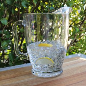 Pitcher of iced water with lemon slices. Approx. 11″ x 7″ (Style of pitcher may vary)