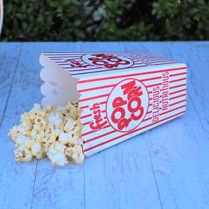Popcorn spilling out of a red and white cardboard popcorn box. Each item is approximately 9″ x 5″