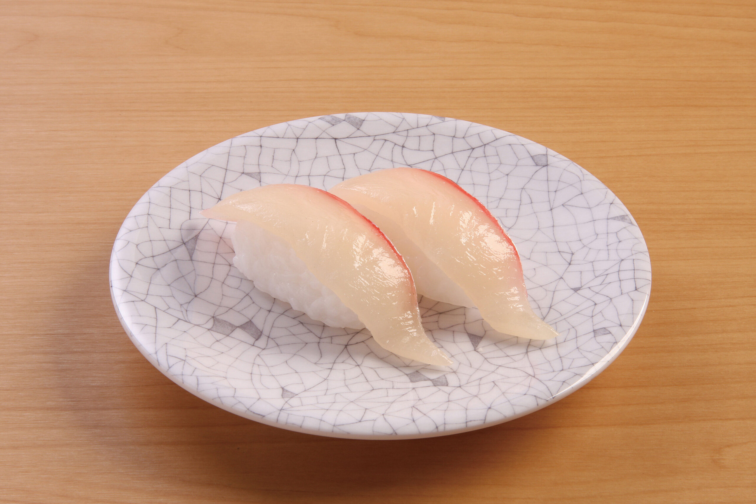Set of 2 hyper-realistic White Fish Nigiri (Shiromi Nigiri) replicas, featuring translucent fish detail and textured rice base. A premium, maintenance-free display solution designed to elevate authentic sushi presentations.